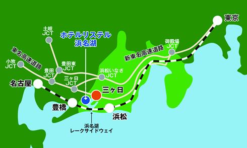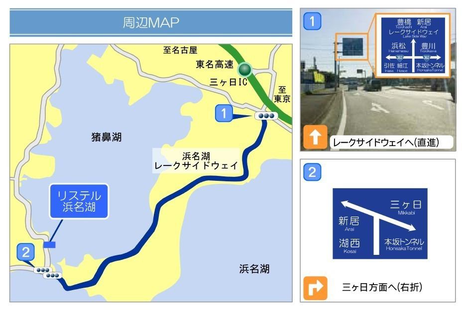 在东名高速道路 三日IC下车, 通过滨名湖湖畔路【濑户隧道南】在红绿灯处右转,沿国道301号直行约300米。