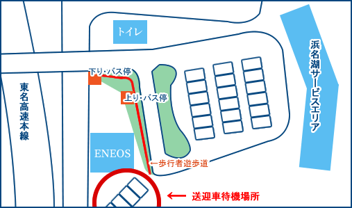 请从巴士站下车到接送车的备用区,沿着长廊步行,然后前往接送站的停车场。步行2, 3分钟。请在LISTEL酒店滨名湖上车。