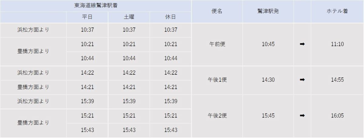 请在抵达天龙滨名湖铁道 / 尾奈站时致电酒店。我会随时接你,直到20点。东海道线 鹫津站 14:30和15:45有2个航班。我们接受前一天的预订。鹫津站出发时间为鹫津站从酒店出发